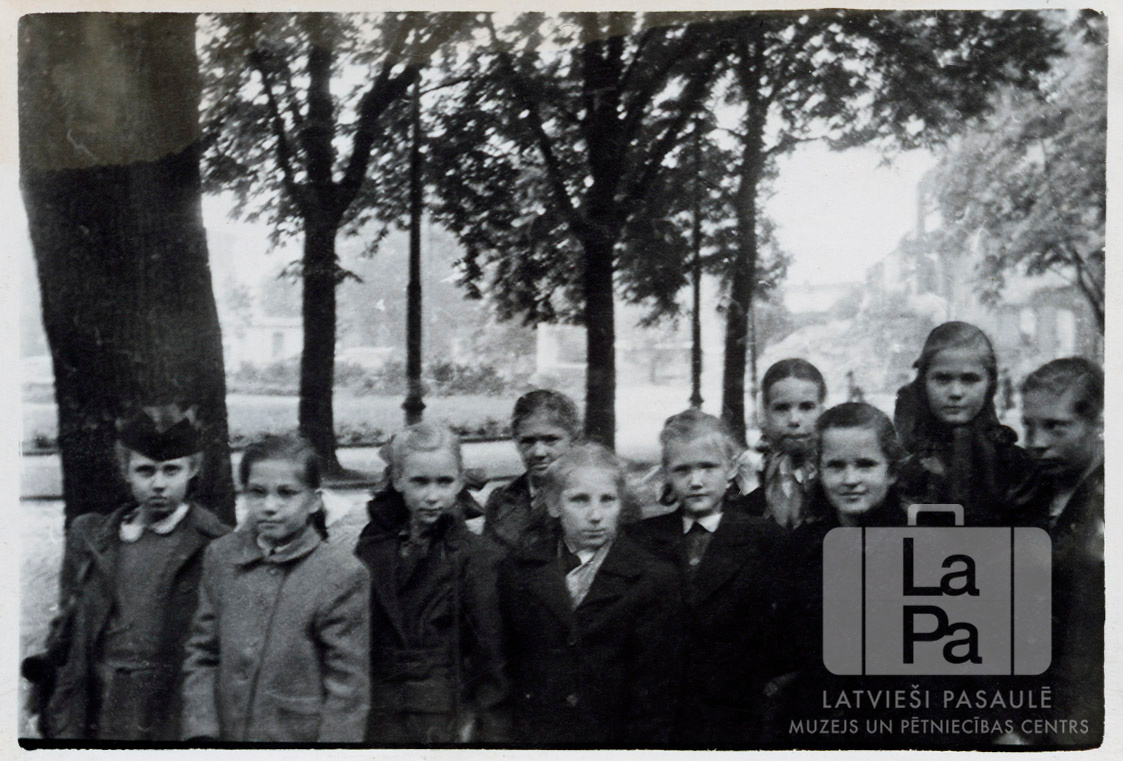 Pamatskolas skolnieces no Hānavas nometnē (angļu zonā) 1947.–1948. gadā izbraukuma laikā. Meitenes mēteļos stāv divās rindās. Fonā ir pilsētas ainava – koki, skvērs ar apstādījumiem; tālumā ir redzamas ēkas un cilvēki. Pirmajā rindā, no kreisās: pirmā Ieva Tomsone, otrā Skaidrīte Krūmiņa (pr. McKeag) un piektā Dzintra Vaivare.