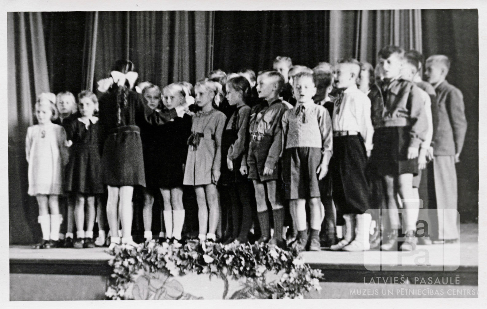 Latviešu skolas koris uzstājas bērnu svētkos Hānavā (angļu zonā). Koris stāv uz skatuves; koristu priekšā stāv diriģente ar muguru pret fotogrāfu. Priekšplānā pie skatuves ir piestiprināts plakāts ar zaru vērteni apkārt. Fonā ir skatuves aizkars. Kora priekšā stāv: Skaidrīte Krūmiņa (pr. McKeag).