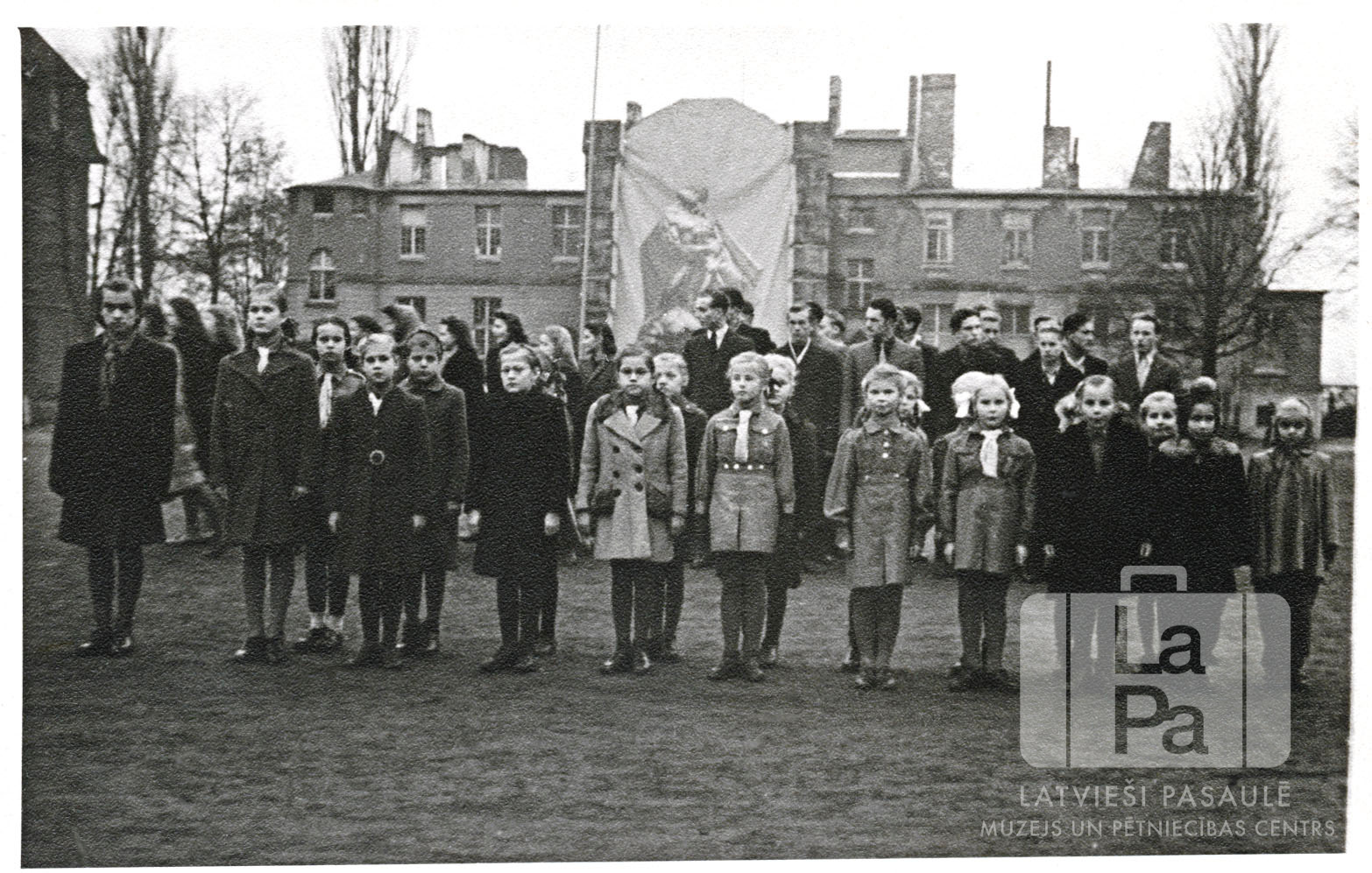 Skrundas 7. gaidu vienības guntiņas stāv ierindā aukstā Latvijas Valsts svētku dienā Hānavā (angļu zonā). Aizmugurē ierindā stāv jaunieši. Fonā uz vairākstāvu mūra ēkas sienas ir liels plakāts, uz kura ir attēlots vīrietis (iespējams, Lāčplēsis). Pirmajā rindā, no kreisās: ceturtā Biruta Tīģere, piektā Skaidrīte Krūmiņa (pr. McKeag) un sestā Inese Viķele