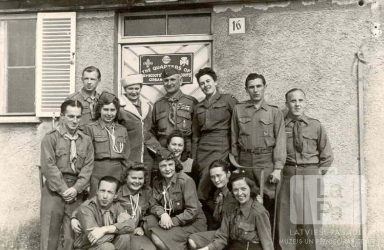 Memmingenas nometnes (angļu zonā) gaidu un skautu vadītāju saime ar organizācijas "United Nations Relief and Rehabilitation Administration" (UNRRA) pārstāvjiem pie gaidu un skautu mītnes ieejas durvīm. Vīrieši un sievietes ir ģērbušies formastērpos. Durvju kreisajā pusē ir logs, bet labajā pusē uz sienas ir cipars "16". Uz durvīm ir zīme ar salasāmu tekstu: "THE QUARTERS OF". Pēdējā rindā, no kreisās: otrā Čeresl kundze (nometnes priekšniece), trešais Pēteris Vīlips (Baltezera 63. skautu vienības priekšnieks).