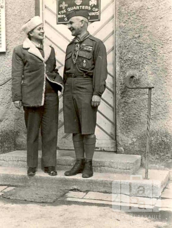 Sieviete un vīrietis stāv pie skautu un gaidu mītnes durvīm Memmingenes nometnē (amerikāņu zonā). Vīrietis ir ģērbies skautu formastērpā. Uz durvīm ir zīme ar salasāmu tekstu: "THE QUARTERS OF". No kreisās: Čeresl kundze (nometnes priekšniece) un Pēteris Vīlips (Baltezera 63. skautu vienības priekšnieks).