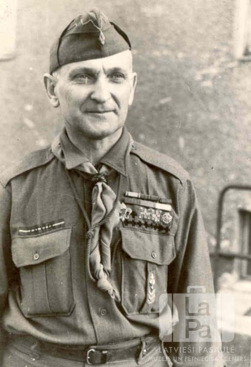 Baltezera 63. skautu vienības priekšnieka, vadītāja Pētera Vīlipa portrets Memmingenē (amerikāņu zonā). Vecāks, gludi skuvies vīrietis skautu formastērpā un cepuri galvā. Fonā ir mūra ēka. Fotogrāfijas mugurpusē ir rakstīts: "Baltezera 51. gaidu vienības "Lielai Guntiņai” vārda dienā! Vecais Vilks.”