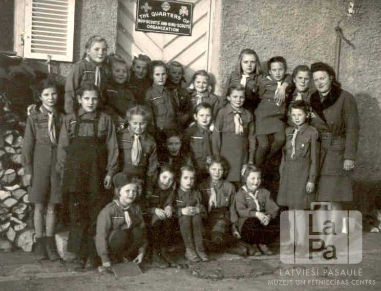 Baltezera 51. gaidu vienības guntiņas Memmingenes nometnē (amerikāņu zonā) 1946. gada rudenī pie gaidu un skautu mītnes ieejas durvīm. Uz durvīm ir zīme: "THE QUARTERS OF / BOY-SCOUTS ' AND GIRL-SCOUTS' / ORGANIZATION". Fonā kreisajā pusē zem loga ir sakrāmēta malka. Pirmā no labās: Skaidrīte Spura (pr. Prince; vadītāja).