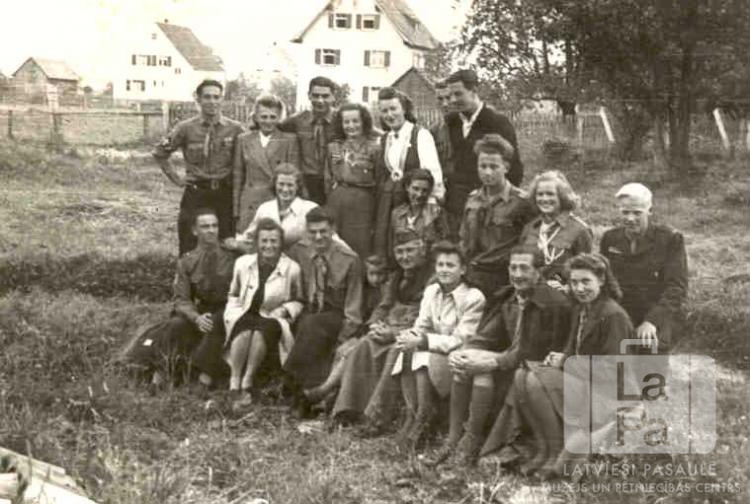 Starptautisko gaidu un skautu vadītāju ugunskurs Memmingenes nometnē (amerikāņu zonā) 1946. gada vasarā netālu no skautu mājiņas. Jaunieši formastērpos, tautastērpos un mēteļos trijās rindās; viņu vidū ir arī mazs bērns. Priekšplānā kreisajā pusē ir redzama daļa no ugunskura. Fonā ir koki un žogs, aiz kura ir vairākas koka un mūra ēkas. Pirmajā rindā, piektais no kreisās: Pēteris Vīlips (vadītājs).