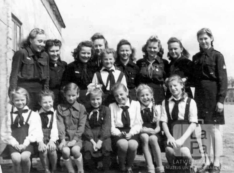 Vaidavas 82. gaidu vienības gaidas un guntiņas ACCU nometnē Hannoverē (angļu zonā). Meiteņu un jauniešu grupa formastērpos trīs rindās. Priekšējā rinda sēž uz sola, aizmugurējās rindas stāv kājās. Kreisajā pusē ir vienstāvu mūra ēka.