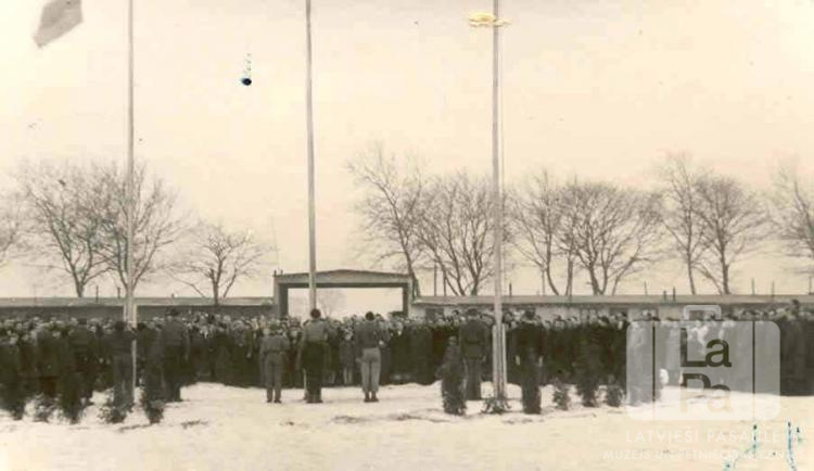 Vaidavas 100. skautu vienība un nometnes iedzīvotāji dzied "Dievs, svētī Latviju!” un sveic Latvijas Valsts karogu ACCU nometnē Hannoverē (angļu zonā). Septiņi skauti stāv pie trīs augstiem karogu mastiem. Apkārt ir sastājies liels cilvēku pūlis. Priekšplānā zeme ir gaiša, klāta ar sniegu. Fonā ir mūra konstrukcija un koki bez lapām.