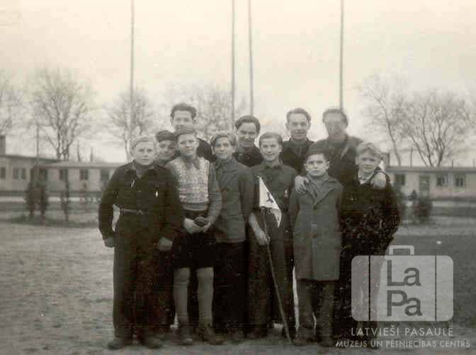 Vaidavas 100. skautu vienība ACCU nometnē Hannoverē (angļu zonā). Zēni un jaunekļi mēteļos un ziemas drēbēs stāv divās rindās. Priekšējā rindā viens zēns tur rokās nūju ar mazu, gaišu karogu. Fonā ir laukums ar apstādījumiem, karogu masti, bezlapu koki un gara vienstāvu mūra ēka.