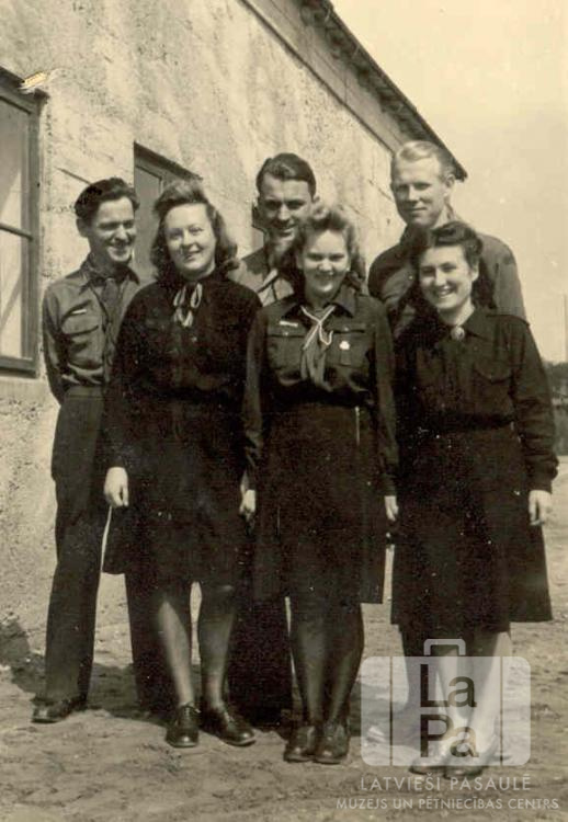 Vaidavas 100. skautu vienības un Vaidavas 82. gaidu vienības vadītāji ACCU nometnē Hannoverē (angļu zonā) formastērpos stāv pie vienstāvu mūra barakas, kas bija atvēlēta telpu nodarbībām un mītnei. Priekšā stāv trīs jaunietes, aizmugurē stāv trīs jaunekļi.