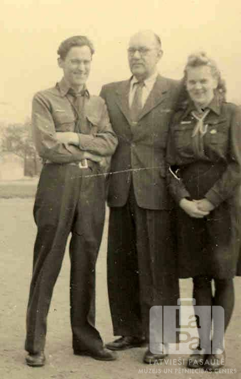 Vaidavas 100. skautu vienības vadītājs un Vaidavas 82. gaidu vienības vadītāja tiekas ar pārstāvi no ACCU nometnes Hannoverē (angļu zonā). Vīrietis un sieviete formastērpos, cits vīrietis uzvalkā. Fonā ir laukums.