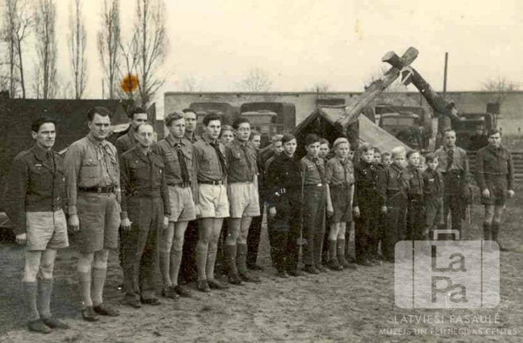 Vaidavas 100. skautu vienības vīrieši un zēni formastērpos stāv ierindā skautu starptautiskā biroja direktora Dž. Vilsona apciemojuma laikā ACCU nometnē Hannoverē (angļu zonā). Fonā kreisajā pusē ir koki bez lapām un ēku jumti. Fonā labajā pusē ir zemi, no baļķiem veidoti, izpušķoti vārti. Aiz vārtiem ir smago automašīnu rinda pie mūra sienas.