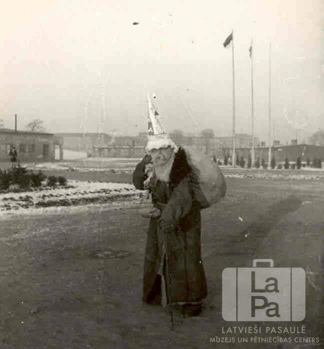 Ziemassvētku vecītis dodas apmeklēt bērnus ACCU nometnē Hannoverē (angļu zonā). Cilvēks biezā mētelī, ar garu bārdu, smailu cepuri galvā, atbalstījies pret nūju un ar maisu pāri plecam. Fonā ir laukums, apstādījumi, viegli apsnigusi zeme un trīs gari masti ar diviem karogiem, kā arī vienstāvu ēkas.
