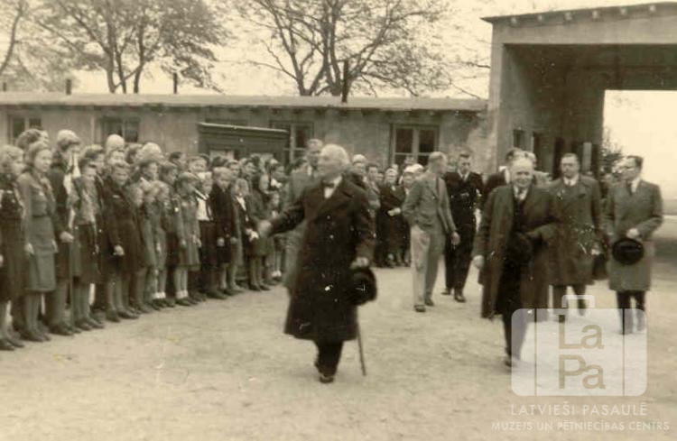 Vaidavas 100. skautu vienība un Vaidavas 82. gaidu vienība sagaida un sveic Latvijas Republikas sūtni Lielbritānijā Kārli Zariņu viņa vizītes laikā ACCU nometnē Hannoverē (angļu zonā). Vīriešu delegācija soļo garām bērnu un jauniešu ierindai formastērpos. Fonā ir zema vienstāvu ēka un plata, nosegta vārtu eja. Delegācijas priekšgalā soļo: Kārlis Zariņš (ar spieķi).