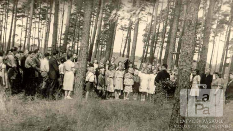 Mācītājs ? Ozols vada dievkalpojumu skautu un gaidu Milzukalna novadu nometnē Dedelstorfā (angļu zonā). Nometnē piedalījās arī skauti un gaidas no ACCU nometnes Hannoverē. Liela cilvēku grupa mežā. Fonā aiz cilvēkiem ir redzama telts/ nojume. Labajā pusē grupas priekšā ir redzams: ? Ozols (tumšās drēbēs, ar muguru pret fotogrāfu).