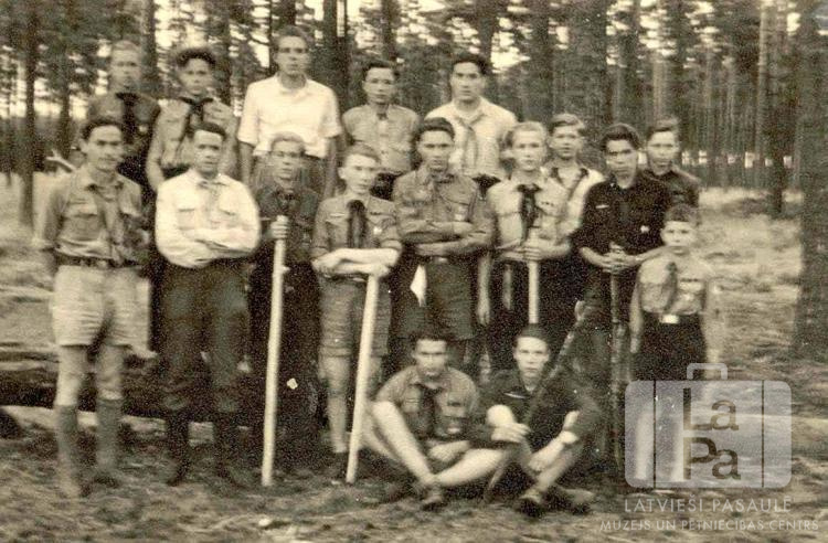 Vaidavas 100. skautu vienība no ACCU nometnes Hannoverē skautu un gaidu Milzukalna novadu nometnē Dēdelsdorfā (angļu zonā). Nometne notika no 1949. gada 11. līdz 24. jūlijam. Zēni un jaunieši trīs rindās. Priekšā divi jaunekļi sēž uz zemes, aizmugurējā rinda stāv uz koka baļķa. Vairākiem skautiem rokās ir nūjas. Fonā ir mežs.