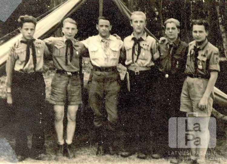 Vaidavas 100. skautu vienības roveri no ACCU nometnes Hannoverē stāv pie telts skautu un gaidu Milzukalna novadu nometnē Dēdelsdorfā (angļu zonā). Nometne notika no 1949. gada 11. līdz 24. jūlijam. Seši jaunieši formastērpos stāv rindā viens otram blakus, uzlikuši rokas viens otram uz pleciem. Fonā ir mežs.