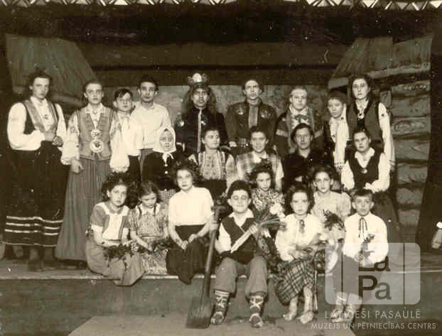 Jaunie aktieri tērpos un grimā uz skatuves Annas Brigaderes lugā "Sprīdītis" ACCU nometnē Hannoverē (angļu zonā). Lugu iestudēja un uzveda Vaidavas 100. skautu vienība un Vaidavas 82. gaidu vienība. Trīs rindas priekšā sēž, aizmugurējā rinda stāv kājās. Vairāki aktieri ir ģērbušies tautastērpos. Fonā ir guļbaļķu ēkas dekorācijas.