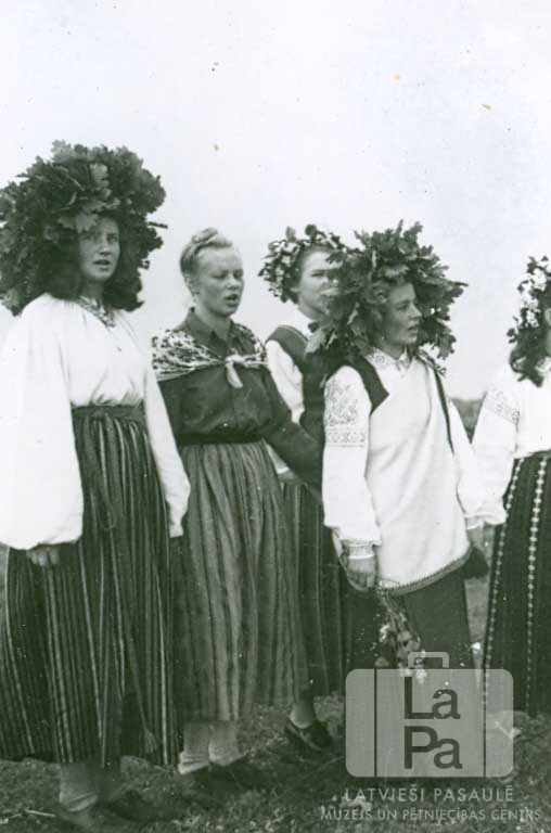 Ausekļa ģimnāzijas audzēkņu Jāņu svētku uzvedums Hohfeldes nometnē Augsburgā (amerikāņu zonā). Jaunietes stāv tautastērpos, vairākām ir lapu vainagi galvās. No kreisās: pirmā Tamāra Vilkina, otrā Frederika Arāja un ceturtā Astra Bračiņa.