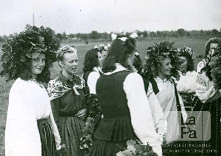 Ausekļa ģimnāzijas audzēkņu Jāņu svētku uzvedums Hohfeldes nometnē Augsburgā (amerikāņu zonā). Jaunietes stāv tautastērpos, vairākām ir lapu vainagi galvās. Vidū stāv sieviete ar muguru pret fotogrāfu. Fonā ir plašs lauks.