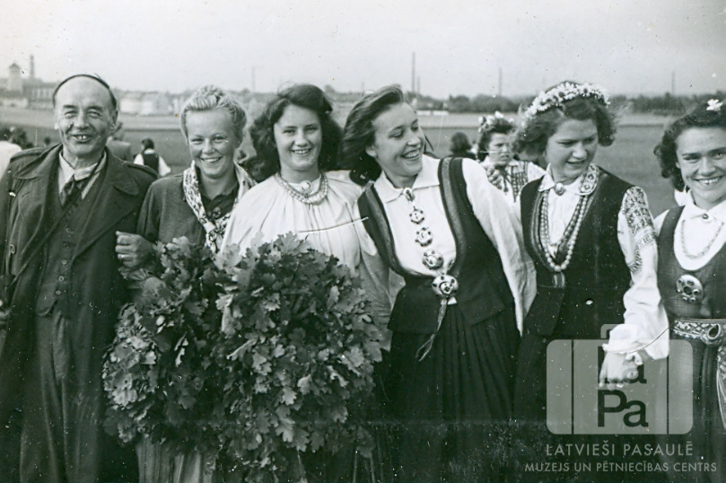 Ausekļa ģimnāzijas audzēkņu Jāņu svētku uzvedums Hohfeldes nometnē Augsburgā (amerikāņu zonā). Vīrietis stāv kopā ar jaunietēm tautastērpos. Fonā ir plašs, līdzens lauks, aiz kura tālumā ir redzama pilsētas ainava. Priekšplānā, no kreisās: ? Bračiņš, Frederika Arāja, Tamāra Vilkina, Austra Demidova, Verēna Stelpe un Brigita Matisone.