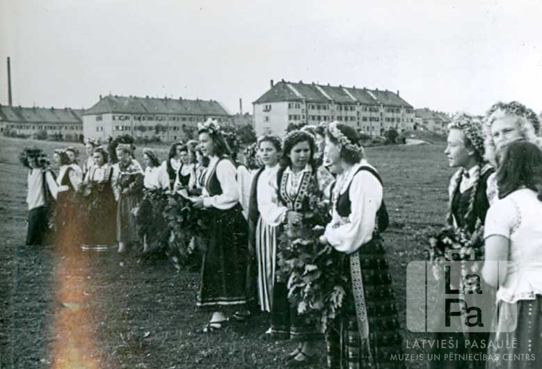Ausekļa ģimnāzijas audzēkņu Jāņu svētku uzvedums Hohfeldes nometnē Augsburgā (amerikāņu zonā). Jaunietes tautastērpos stāv rindā. Vairākām jaunietēm galvās un rokās ir lapu vainagi. Fonā ir plašs laukums un nometnes vairākstāvu dzīvojamās mūra ēkas. No labās: pirmā Vizma Grundmane un otrā Ruta Saulgoze.