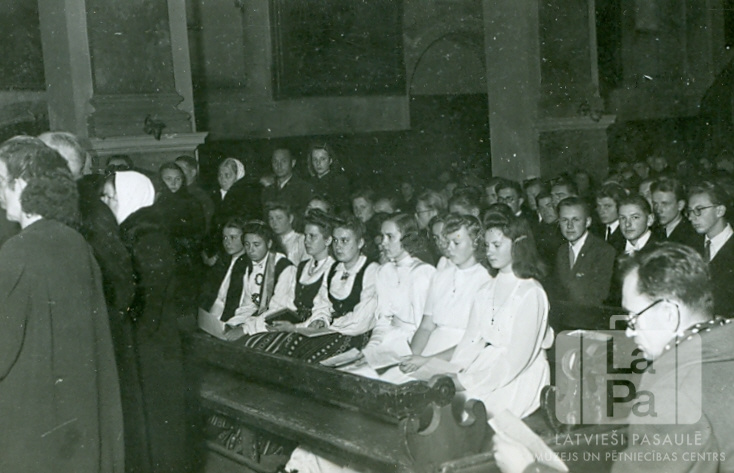 Latviešu luterāņu baznīca no Hohfeldes nometnes Augsburgā (angļu zonā) veic iesvētības Sv. Annas baznīcā Augsburgā. Jaunieši gaišās kleitās, tautastērpos un uzvalkos vairākās rindās sēž koka solos. Priekšā kreisajā pusē stāv cilvēku grupa ar muguru pret fotogrāfu. Priekšplānā labajā pusē vīrietis lasa bukletu. Fonā ir redzama baznīcas iekšpuse – gleznas pie sienām un balsti. Pirmajā jauniešu rindā, no labās: pirmā Temāra Vilkina un otrā Frederika Arāja.