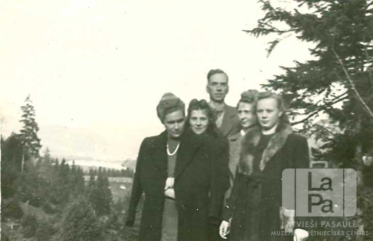 Ausekļa ģimnāzija no Hohfeldes nometnes Augsburgā (angļu zonā) ekskursijas laikā uz "Karwendelgebirge" kalniem pie Mitenvaldes ("Mittenwald"). Mūsdienās "Karwendelgebirge" kalni atrodas Austrijas teritorijā. Četras sievietes un jauns vīrietis stāv trīs rindās. Fonā ir ar mežu apaugusi nogāze un lauki. Pirmajā rindā, otrā no kreisās: Frederika Arāja.