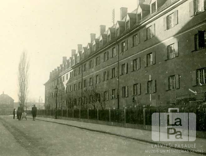 Iela pie trīsstāvu mūra ēkas Hohfeldes nometnē Augsburgā (amerikāņu zonā). Ielu no ēkas atdala žogs. Uz ielas kreisajā pusē ir redzami vairāki gājēji. Foto albumā zem attēla bija rakstīts: "Tas dīpīšu Hochfeldas lēģeris Augsburgā. Mūsu familijas rezidence."