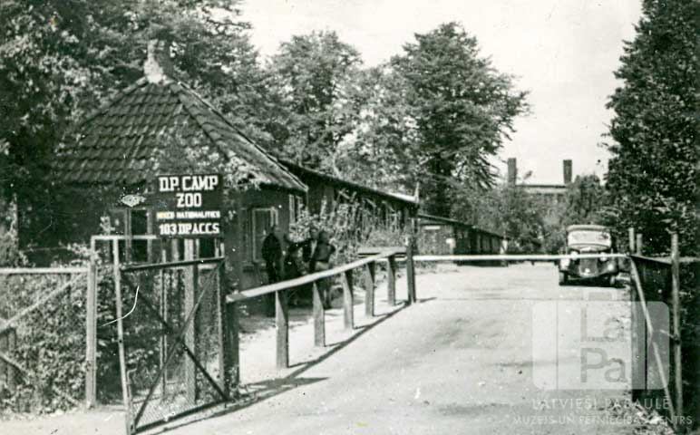 Ieejas vārti Zoo nometnē Hamburgā (angļu zonā). Redzama iebrauktuve ar vārtu barjeru priekšā, aiz kuras stāv vieglā automašīna. Kreisajā pusē ir gājēju vārti ar zīmi: "DP CAMP / ZOO / ... / 103 DPACCS". Aiz gājēju vārtiem ir gājēju zona, no brauktuves atdalīta ar dēļu žogu. Gājēju zonas kreisajā pusē ir vienstāvu ēka ar dakstiņu jumtu, pie kuras ir redzami cilvēki. Apkārt aug koki, tālāk nometnē ir redzamas vairākas ēkas.