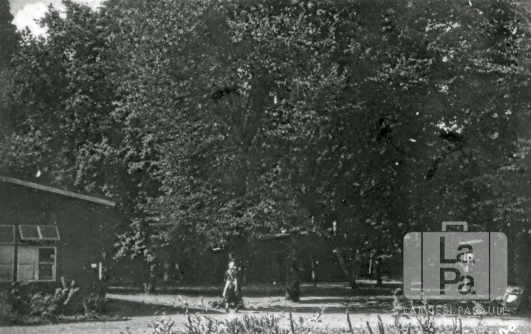 Cilvēks soļo pāri ar kokiem apaugušam pagalmam vienstāvu koka ēkas priekšā Zoo nometnē Hamburgā (angļu zonā). Iespējams, skats nometnē pirms vētras.