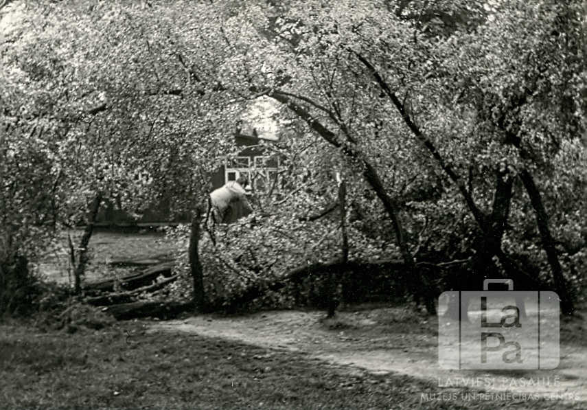 Ziedoši koki pie ēkas Zoo nometnē Hamburgā (angļu zonā). Priekšplānā ir zemi, nokareni koki un salauzts žogs, aiz kura ir pagalms pie ēkas. Pagalmā ir pēc vētras nokrituši zari un cilvēks pie ēkas logiem.