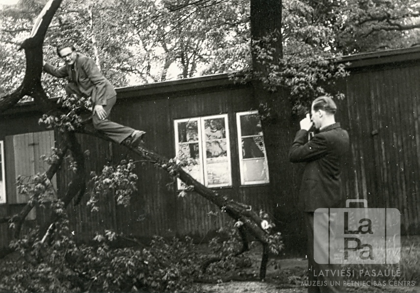 Divi vīrieši pie liela, nokrituša koka zara pēc vētras Zoo nometnē Hamburgā (angļu zonā). Viens vīrietis uzvalkā ir uzrāpies uz zara, otrs vīrietis uzvalkā viņu fotografē. Fonā ir vienstāvu koka ēka ar koka stumbru pie ēkas logiem; aiz ēkas ir koki. No kreisās: Voldemārs Ašmanis un Uldis Kronītis.