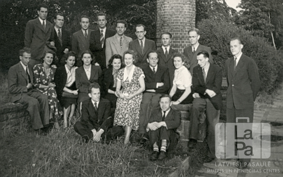 Studentu kopa Zoo nometnē Hamburgā (angļu zonā). Vīrieši un sievietes vairākās rindās; vīrieši ir ģērbušies uzvalkos. Otrā rinda sēž uz zema akmens mūra. Fonā ir resna ķieģeļu kolonna/ skurstenis un mežs. Pēdējā rindā, no kreisās: pirmais Valentīns Kore (izceļoja uz Ameriku un bija zobārsts Milvokos) un trešais Uldis Kronītis.