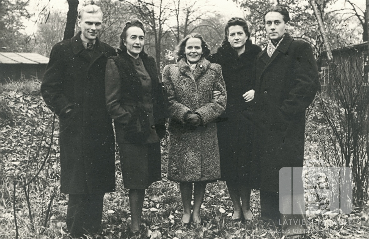Divi latviešu vīri un trīs igauņu dāmas no Zoo nometnes Hamburgā (angļu zonā). Zoo nometnē bija visvairāk latviešu bēgļi un arī daži igauņi. Pieci cilvēki mēteļos stāv viens otram blakus. Fonā ir redzamas divas zemas vienstāvu barakas un koki. No kreisās: Bernhards Kazubirnis, Alise ?, Liene ?, Linda ? un Uldis Kronītis.