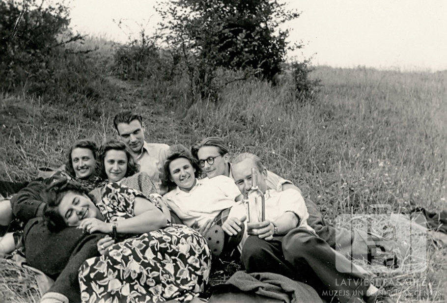 Jaunieši no Hamburgas (angļu zonā) atpūtas izbraukumā uz kalniem. Jaunekļi un jaunietes guļ un sēž zālē; viens vīrietis rokā tur caurspīdīgu stikla dzērienu pudeli. Fonā uz nogāzes ir krūmi. Priekšā, pirmā no kreisās: Aina Galēja. Otrajā rindā, no kreisās: pirmā Nellija Ladusāne, trešā Velta Jurika. Trešajā rindā, pirmais no kreisās: ? Kore.