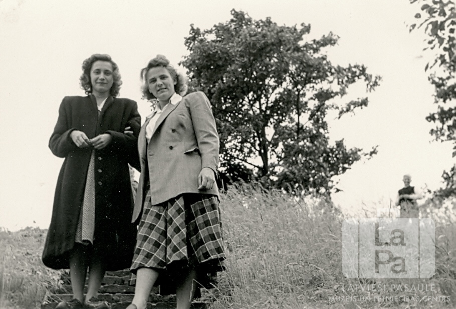 Divas jaunas sievietes no Hamburgas (angļu zonā) stāv uz kāpnēm izbraukuma laikā uz kalniem. Abpus kāpnēm uz nogāzes aug zāle. Fonā nogāzes augšpusē starp kokiem ir redzams vīrietis. Priekšā, no kreisās: Aina Galēja un Nellija Ladusāne.