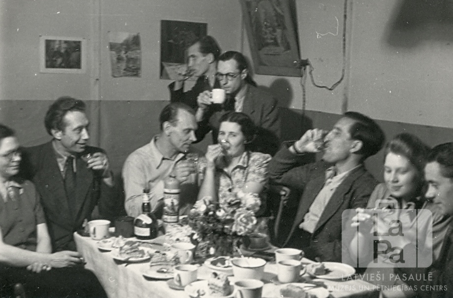 Viesi ar paceltām glāzēm pie galda dzimšanas dienas svinībās Zoo nometnē Hamburgā (angļu zonā). Septiņi jaunieši sēž pie galda, divi vīrieši stāv aizmgurē telpas stūrī. Uz galda ir ēdienu un dzērienu trauki, kā arī ziedi vāzē. Fonā uz sienām ir glezna un vairāki attēli. Pirmais no labās: Uldis Kronītis.