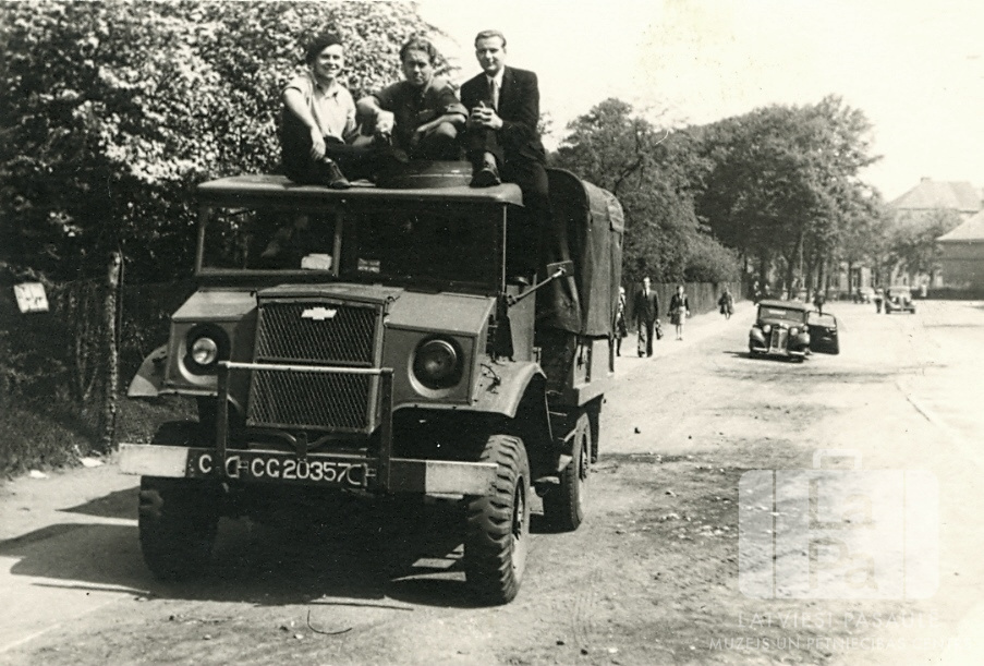 Trīs jaunekļi "melno rotas" darbu laikā sēž uz smagās automašīnas kabīnes jumta Hamburgā (angļu zonā). Kreisajā pusē aiz žoga ir koki. Fonā ir iela ar automašīnām un gājējiem uz ietves. Tālumā, ielas galā, ir redzamas vairākas mūra ēkas. Uz automašīnas sēž, otrais no kreisās: Uldis Kronītis.