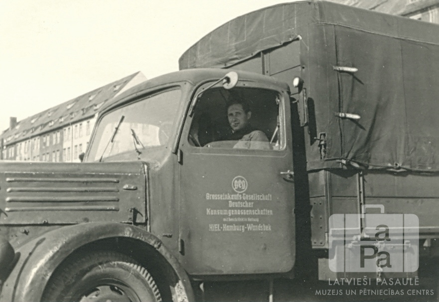 Vīrietis "melno rotas" darbu laikā sēž smagās automašīnas kabīnē Hamburgā (angļu zonā). Fonā ir redzamas divas mūra ēkas.