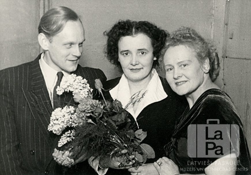 Trīs cilvēku satikšanās Zoo nometnē Hamburgā (angļu zonā). Vīrietis ar divām sievietēm. Viena no sievietēm tur rokās ziedus. No kreisās: Ingus Nāruns (čellists), Austra Nārune un Fanija Nārune.