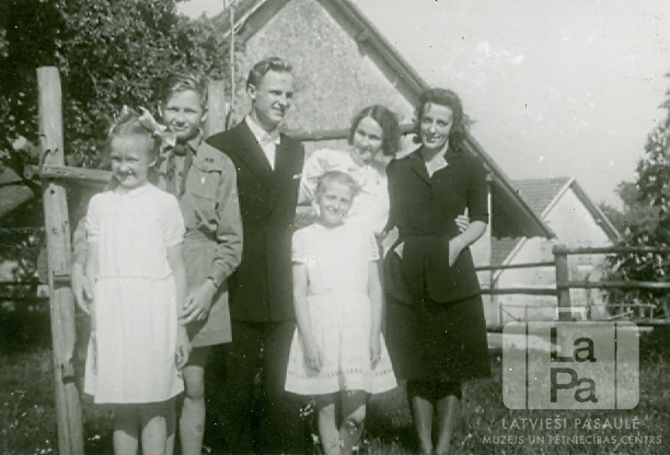 Sešu cilvēku grupa Ulda Klausa iesvētību dienā stāv zālē pie koka sētas Ēbenveileres nometnē (franču zonā) 1947. gada vasarā. Viņu vidū stāv divas meitenes gaišās kleitās, skauts formastērpā un puisis uzvalkā. Fonā ir divas ēkas. Priekšā, no kreisās: Ārija Mežgrāve un Silvija Klausa. Aizmugurē, no kreisās: pirmais Andris Mežgrāvis, otrais Uldis Klauss.