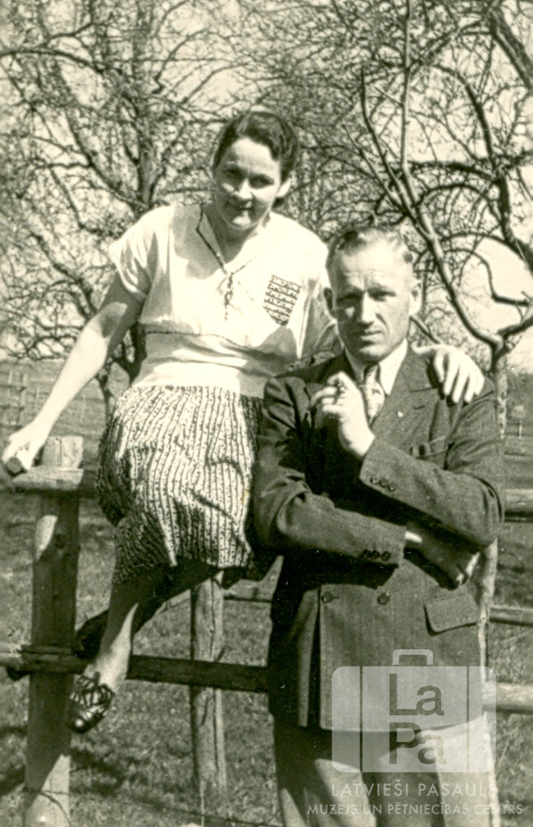 Mežgrāvu pāris pie koka sētas Ēbenveilerē (franču zonā) 1946. gada ziemā. Sieviete uz koka sētas sēž, vīrietis stāv uz zemes viņai blakus. Fonā ir koki. No kreisās: No kreisās: Austra Mežgrāve un Fricis Mežgrāvis.