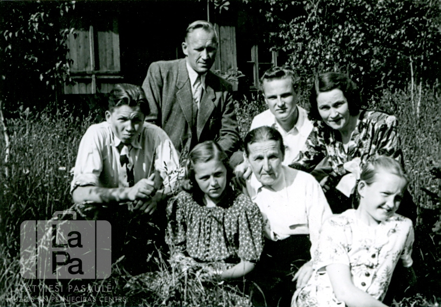 Klausu un Mežgrāvu ģimenes sēž zālē Ēbenveilerē (franču zonā). Abas ģimenes bēgļu nometnē kopā pavadīja piecus gadus. Fonā ir koka ēka. Priekšā, no kreisās: Andris Mežgrāvis, Silvija Klausa, Rozālija Miesniece un Ārija Mežgrāve. Aizmugurē, no kreisās: Fricis Mežgrāvis, Uldis Klauss un Austra Mežgrāve.