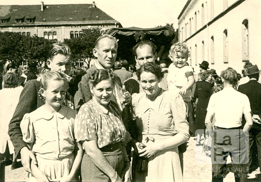 Mežgrāvu ģimene atvadās no ilggadīgiem nometņu draugiem Ēbenveilerē (franču zonā), ģimenei izceļojot uz Venecuēlu. Cilvēki stāv divās rindās priekšplānā. Fonā cilvēki stāv pie ar brezentu pārklātas smagās automašīnas, aiz kuras ir koku apstādījumi un divas vairākstāvu mūra ēkas. Priekšā, no kreisās: pirmā Ārija Mežgrāve un trešā Austra Mežgrāve. Aizmugurē, no kreisās: pirmais Andris Mežgrāvis un otrais Fricis Mežgrāvis.