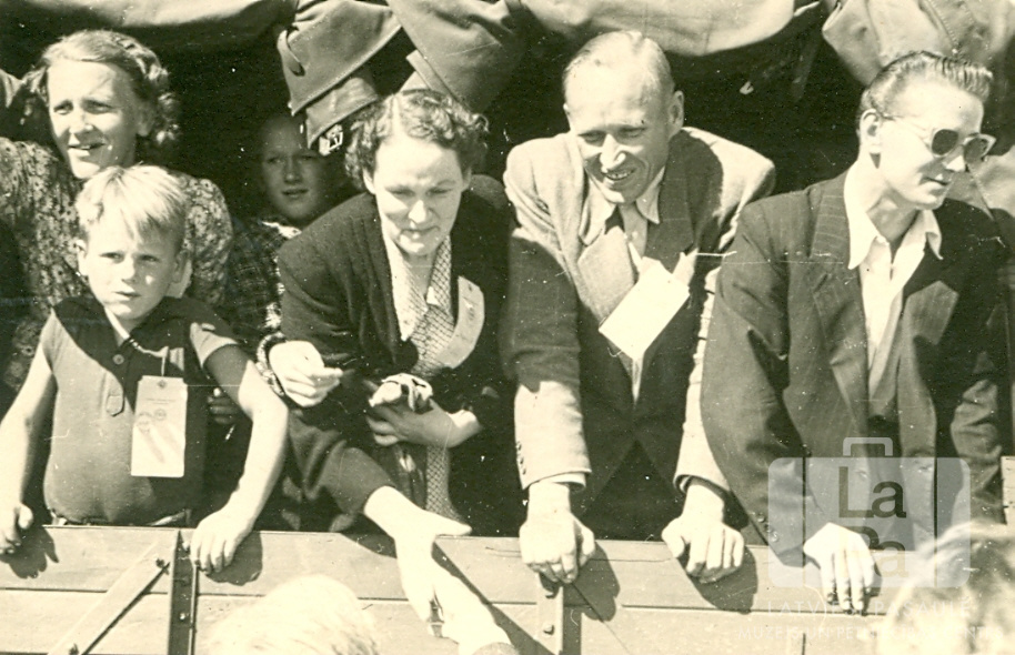 Mežgrāvu ģimene smagajā kravas automašīnā atvadās no ilggadīgiem nometņu draugiem Ēbenveilerē (franču zonā), ģimenei izceļojot uz Venecuēlu. Viena no sievietēm sniedz pēdējo rokasspiedienu palikušajiem cilvēkiem. Automašīnas pasažieriem pie apģērba ir gaišas izceļošanas birkas. Priekšā, no kreisās: otrā Austra Mežgrāve un trešais Fricis Mežgrāvis.