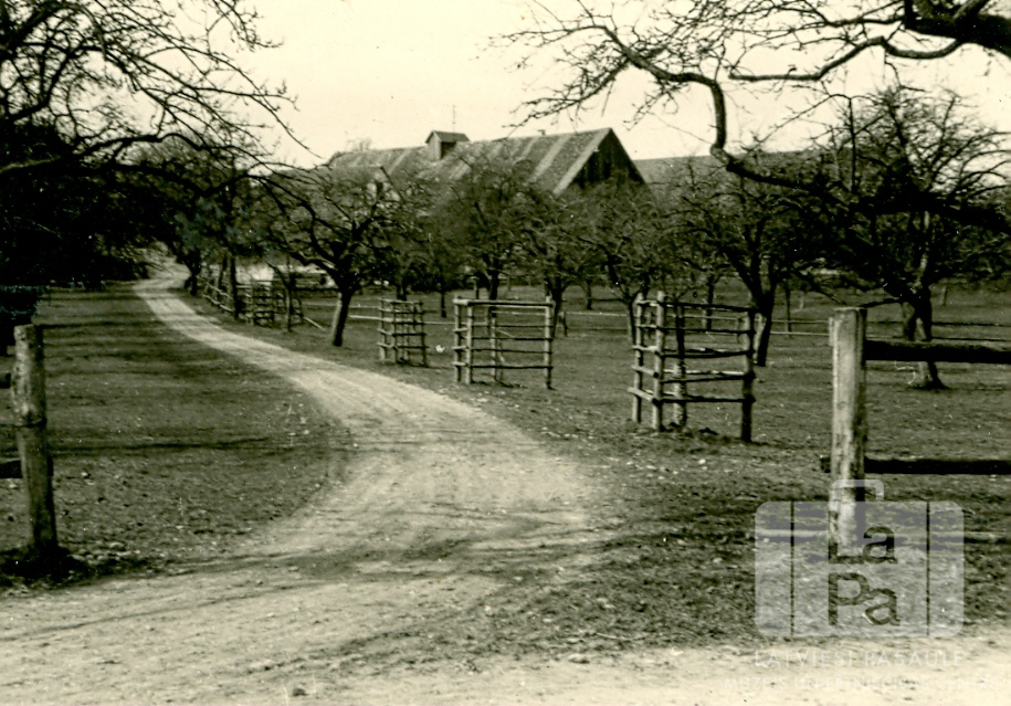 Klausu ģimenes mājvietas piebraucamais ceļš Fronhofenes ciematā 3 km no Ēbenveileres nometnes (franču zonā) 1946. gada ziemā. Priekšplānā ir šaurs zemes ceļš ar augļu koku dārzu labajā pusē. Kokiem nav lapas. Auz dārza ir redzami divu ēku jumti.