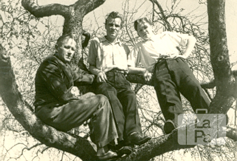 Trīs vīrieši no Ēbenveileres (franču zonā) 1946. gada atpūšas kokā. Iespējams, attēls ir uzņemts Fronhofenes ciematā 3 km no Ēbenveileres. Divi jaunekļi ir ģērbušies gaišos kreklos bez piedurknēm. No kreisās: Fricis Mežgrāvis, Uldis Klauss un Andris Mežgrāvis.