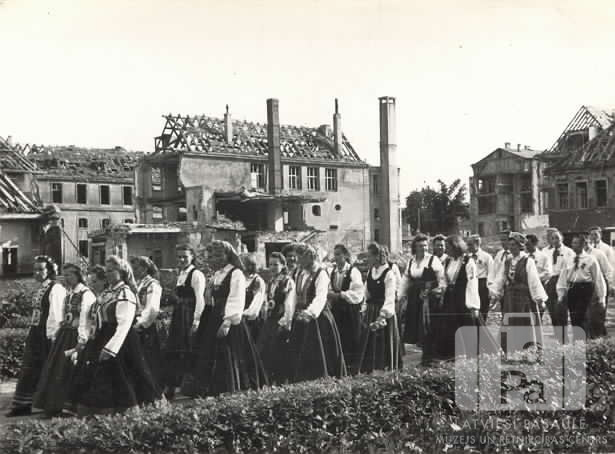 Sievietes un vīrieši tautastērpos dodas gājienā uz Baltijas Sporta svētkiem Hohfeldes nometnē Augsburgā (amerikāņu zonā). Priekšā soļo sievietes, aiz viņām dodas vīrieši. Fonā ir ēku drupas – Otrajā pasaules karā izpostītas dzīvokļu ēkas. Foto autors: Uldis Ohaks.