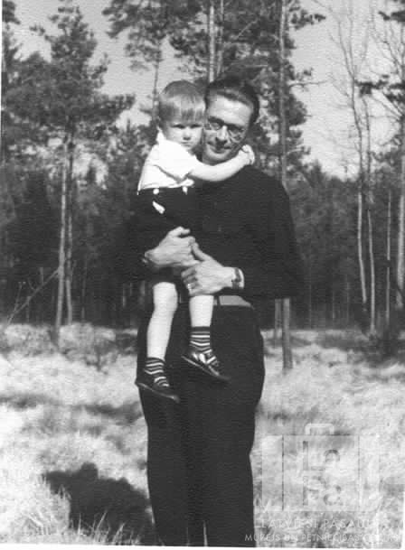 Alfrēdis Ruslēvics ar krustdēlu Hohfeldes nometnē Augsburgā (amerikāņu zonā) 1949. gada pavasarī. Vīrietis "melno vienības" formastērpā stāv ar mazu zēnu rokās. Fonā ir mežs. No kreisās: Arnis Ohaks un Alfrēdis Ruslēvics.