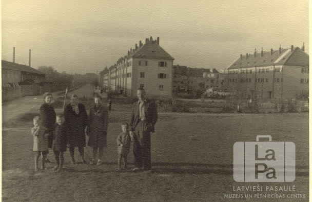 Cilvēku grupa stāv laukumā Hohfeldes nometnē Augsburgā (amerikāņu zonā) 1945. gada rudenī – 1946. gada pavasarī. Fonā ir redzamas trīs rindas ar vairākstāvu dzīvojamajām ēkām. Priekšā stāv mazi zēni, no kreisās: Dainis Ohaks, Miervaldis Ohaks un Uldis Ohaks. Aizmugurē stāv, no kreisās: Malvina Širons, Lidija Ohaks, Rita Vanags un Saša Hartmanis.