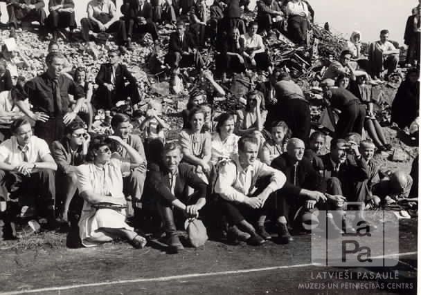 Skatītāji sēž uz zemas nogāzes Baltijas sporta svētkos Hohfeldes nometnē Augsburgā (amerikāņu zonā). Cilvēku grupa sēž saulē un skatās tālumā. Iespējams, cilvēki sēž uz būvgružu kaudzes. Priekšplānā uz zemes ir laukuma līnija. Pirmajā rindā, trešais no kreisās: Didriķis Ohaks (ar gaišu kreklu). Otrajā rindā, no kreisās: piektā Malvīna Širons (?) un sestā Lidija Ohaks (?).
